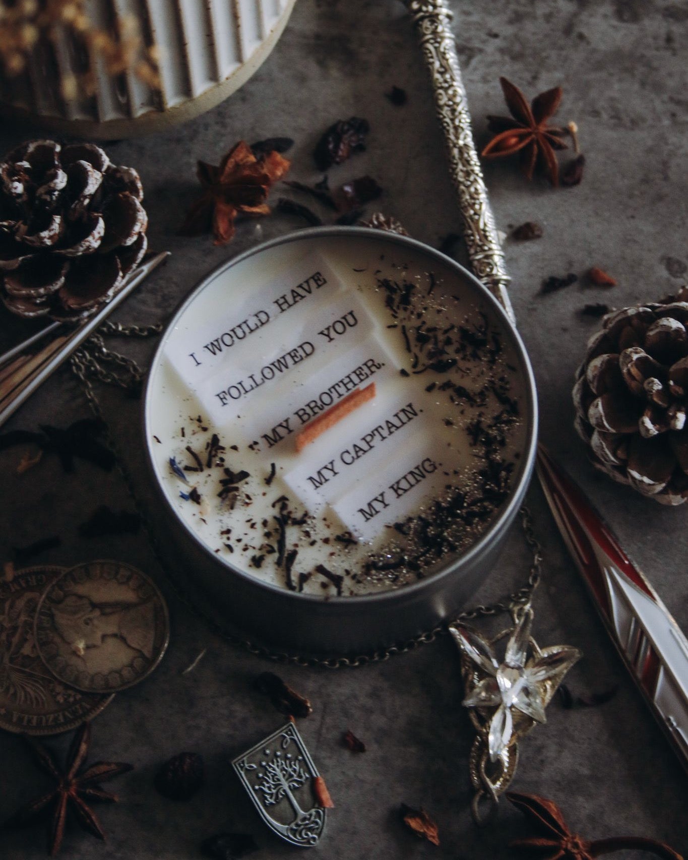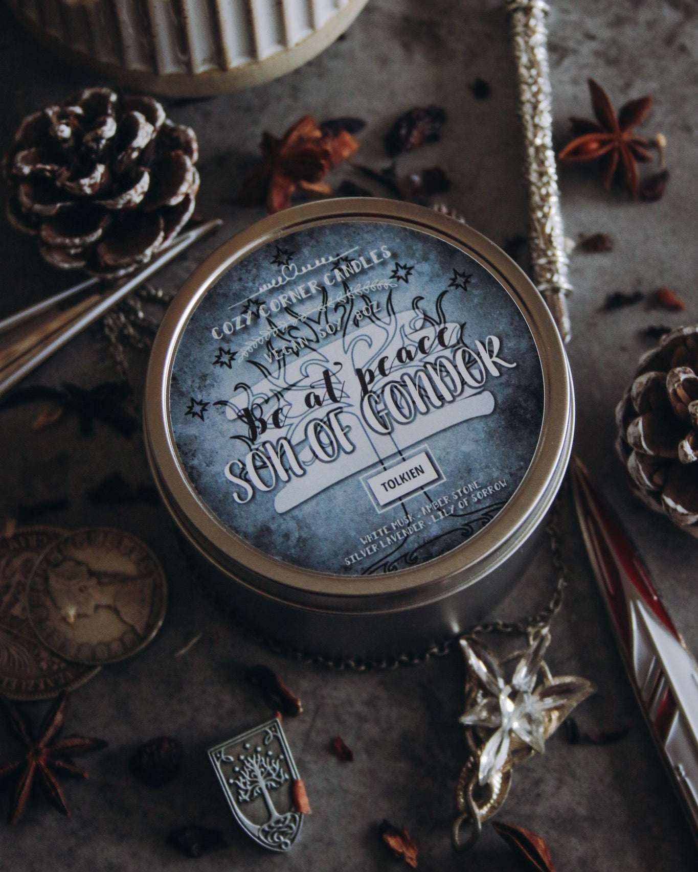 8oz Wood Wick Silver Tin Candle inspired by Tolkien's The Lord of the Rings.