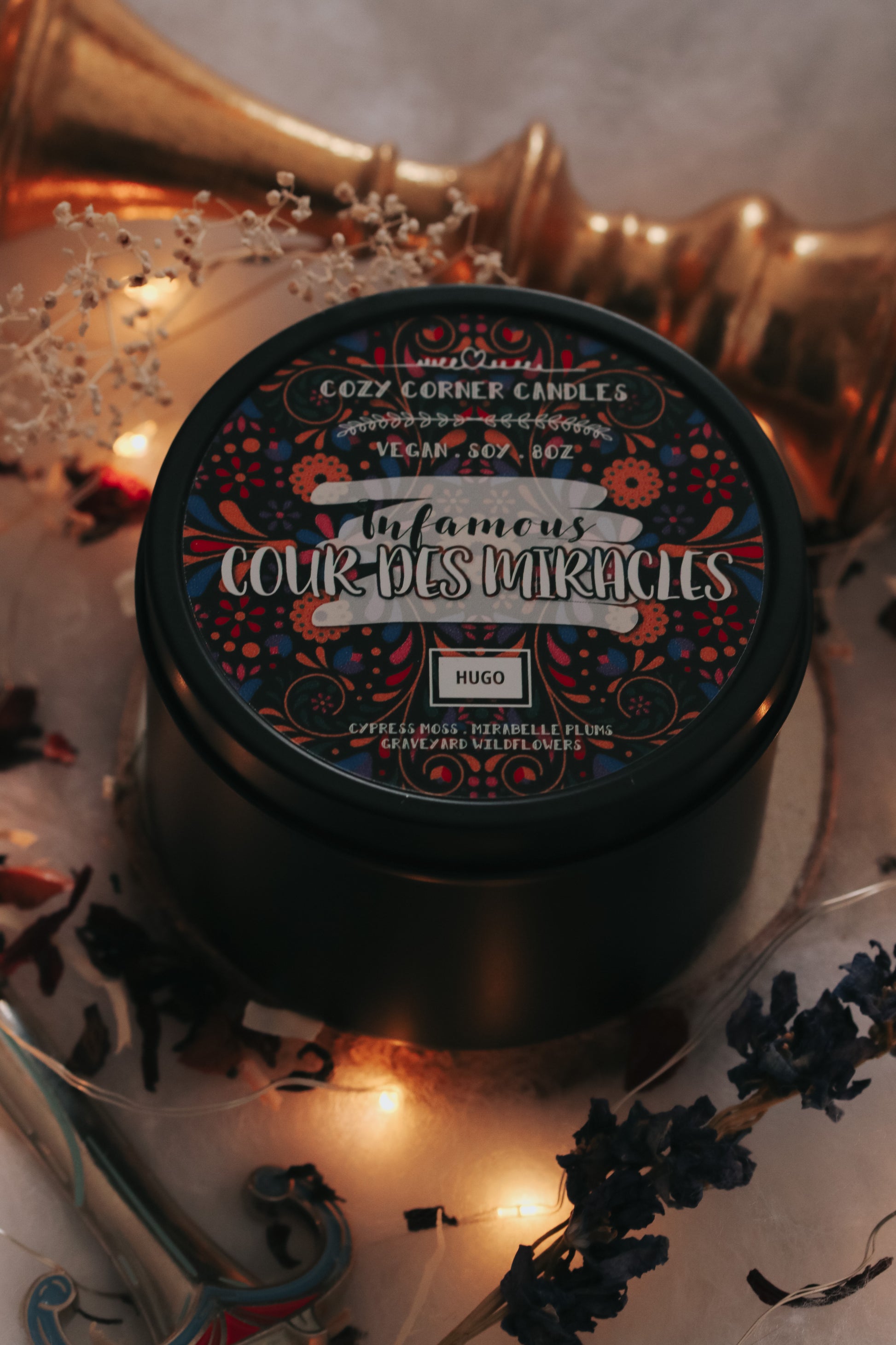 8oz Wood Wick Black Tin Candle inspired by classic "Notre Dame de Paris" by Victor Hugo.