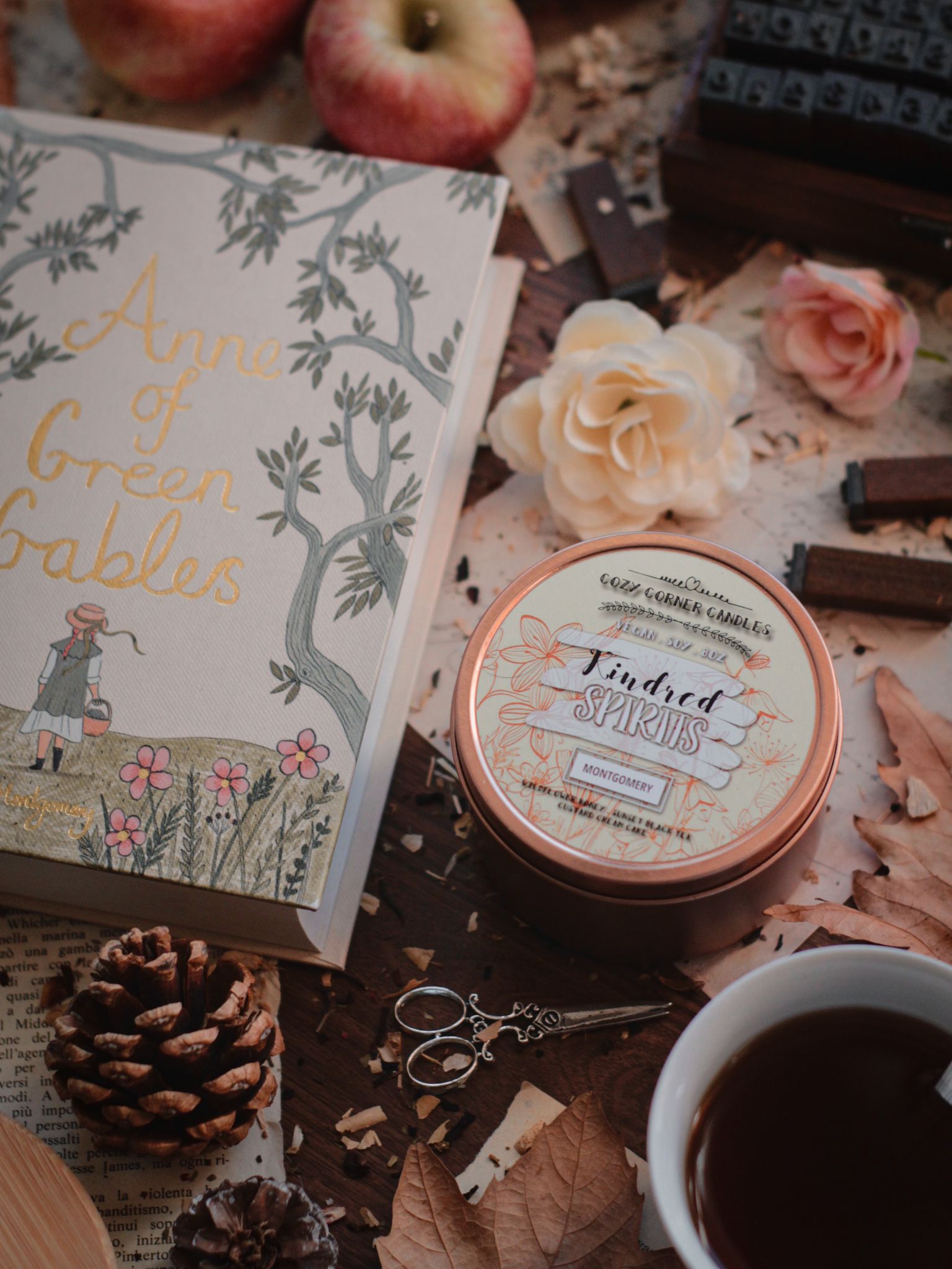 8oz Wood Wick Rose Gold Tin Candle inspired by Classic Anne of Green Gables, smells like Wildflower Honey, Sunset Black Tea & Custard Cream Cake!