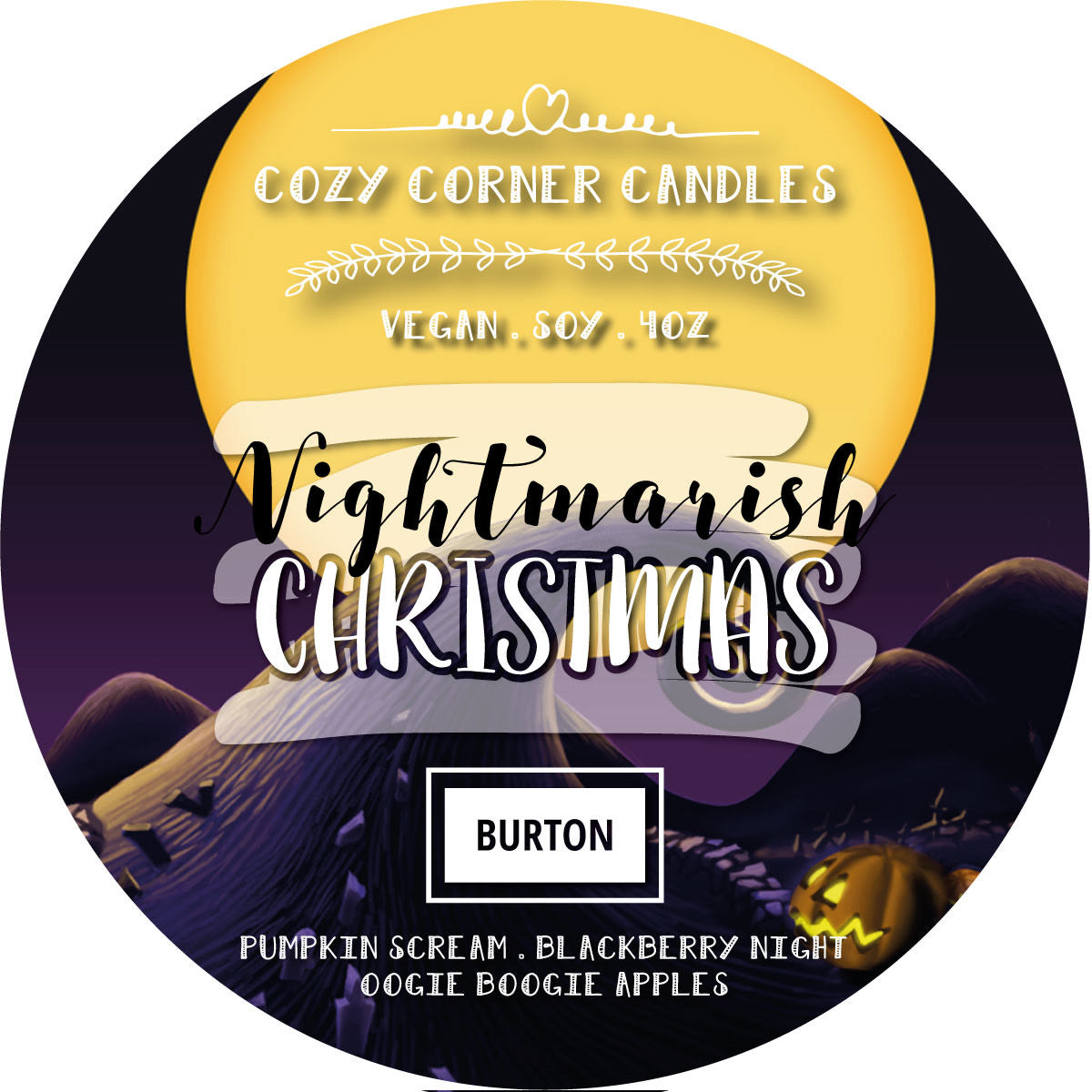 4oz Wood Wick Black Tin inspired by Tim Burton's Nightmare Before Christmas, smells like Pumpkin Scream, Blackberry Night & Oogie Boogie Apples!