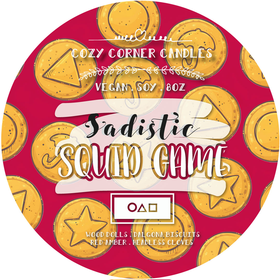 8oz Wood Wick Black Tin inspired by Squid Game: the contrast between childhood and cruelty coming together in this candle that smells like contradiction itself: Wood dolls, Dalgona Biscuits, Red Amber & Headless Cloves. Like good memories tinted in dark colors.